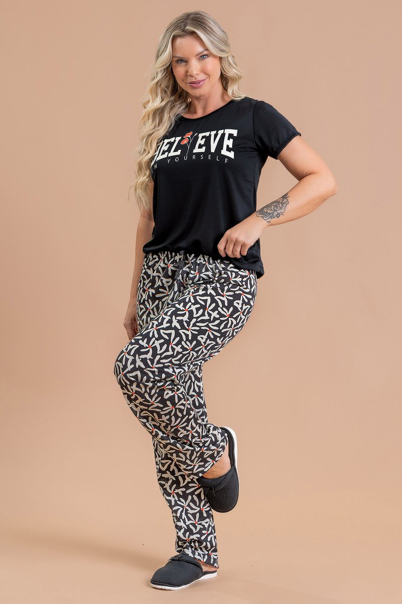 Pijama feminino confeccionado em 100% poliéster, parte superior com estampa de frase e inferior com estampa rotativa em formas abstratas e com cadarço decorativo no cós.