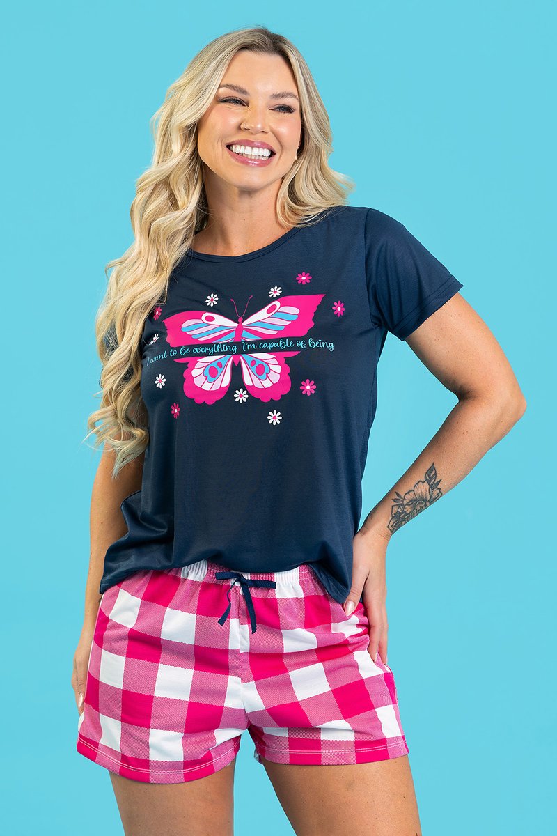 Pijama confeccionado em 100% poliéster na blusa e shorts, parte superior com estampa de borboleta e inferior com estampa rotativa em xadrez com cadarço decorativo no cós.