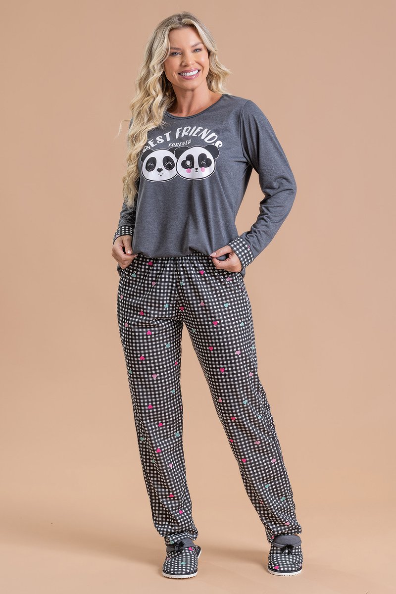 Pijama de inverno confeccionado em 100% poliéster, parte superior com estampa de pandinhas e frase e inferior com estampa rotativa em xadrez com corações.
