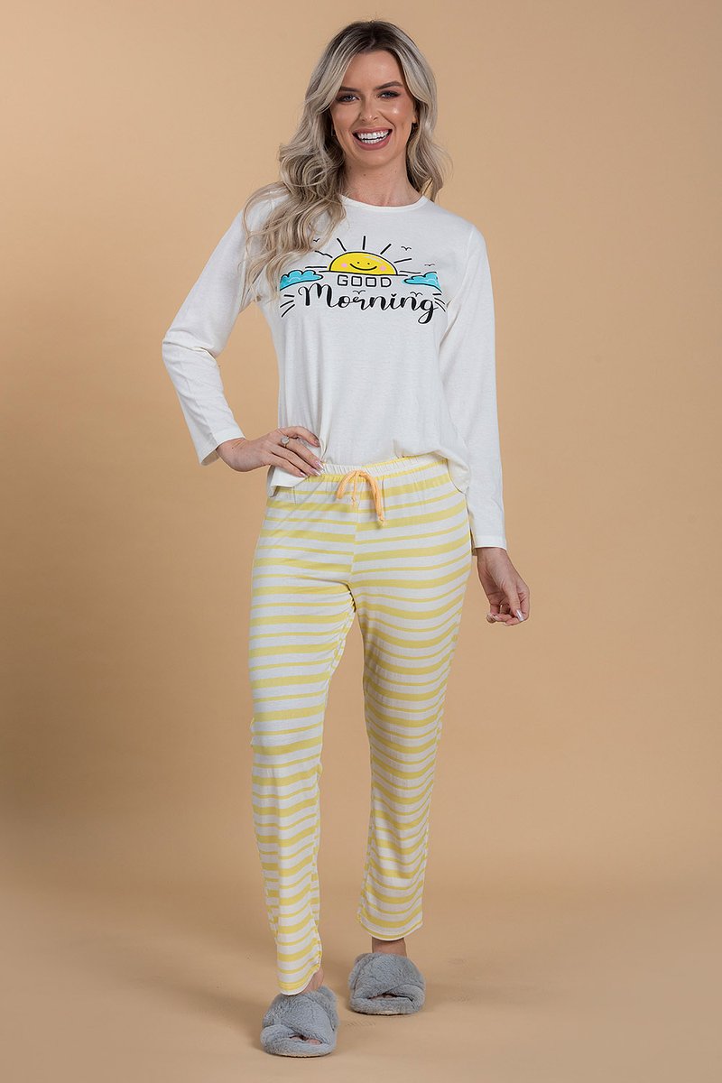 Pijama confeccionado em 100% algodão na blusa e calça em 48% Poliéster, 48% Viscose 4% Elastano, parte superior com estampa de sol e nuvem com frase e inferior em listras e com cadarço decorativo no cós.