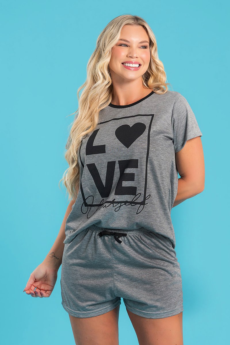 Pijamas confeccionado em 100% poliéster, parte superior com estampa de frase e inferior liso na cor mescla com cadarço decorativo no cós.