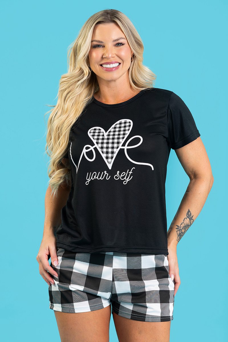 A blusa exibe estampa central com a mensagem “Love Yourself” em tipografia arredondada, acompanhada de detalhes gráficos em formato de pequenas pétalas ao redor. Essa composição visual alinha-se às tendências de lifestyle que promovem autoconhecimento e cuidado pessoal. Já o shorts traz padronagem xadrez em contraste suave, reforçando o caráter jovem e contemporâneo do conjunto, conferindo leveza ao look de repouso.