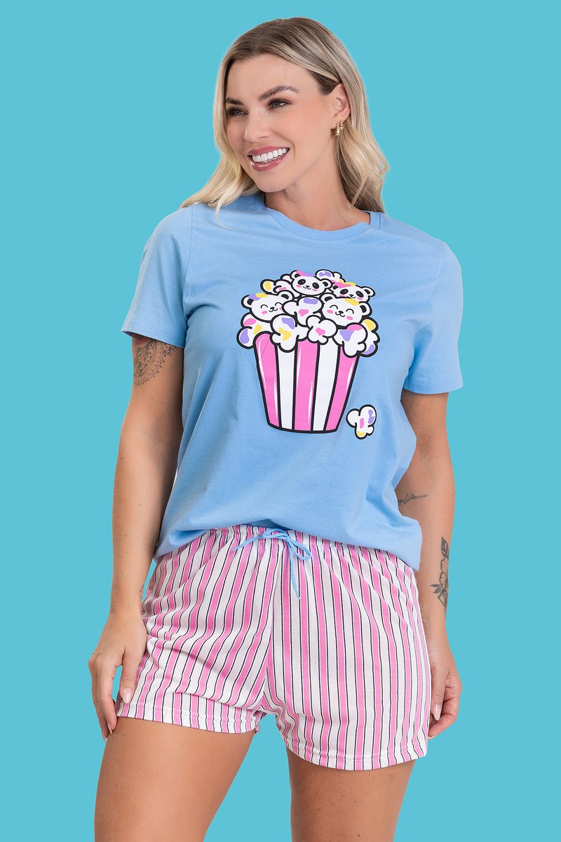 Pijama confeccionado em 100% algodão na blusa e 100% poliéster no shorts, parte superior com estampa de pote com pipocas e inferior com estampa rotativa em listras rosas e com caraço decorativo no cós.