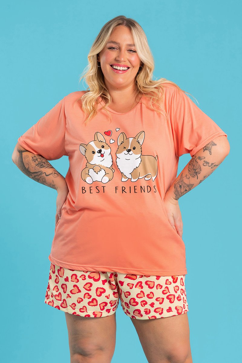 Pijama confecçionado em 100% poliéster, parte superior com estampa de dogs e frase, inferior com estampa rotativa com corações.