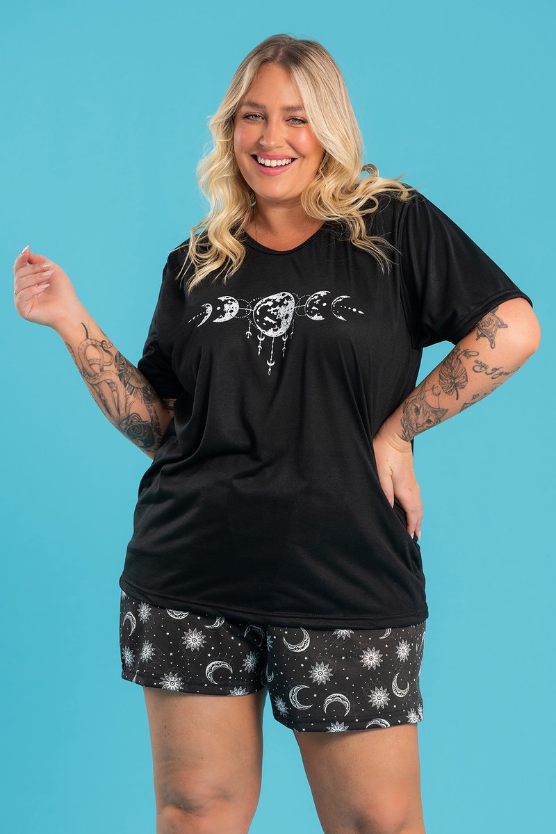 Pijama confecçionado em 100% poliéster, parte superior com estampa de lua, inferior com estampa rotativa mistica.