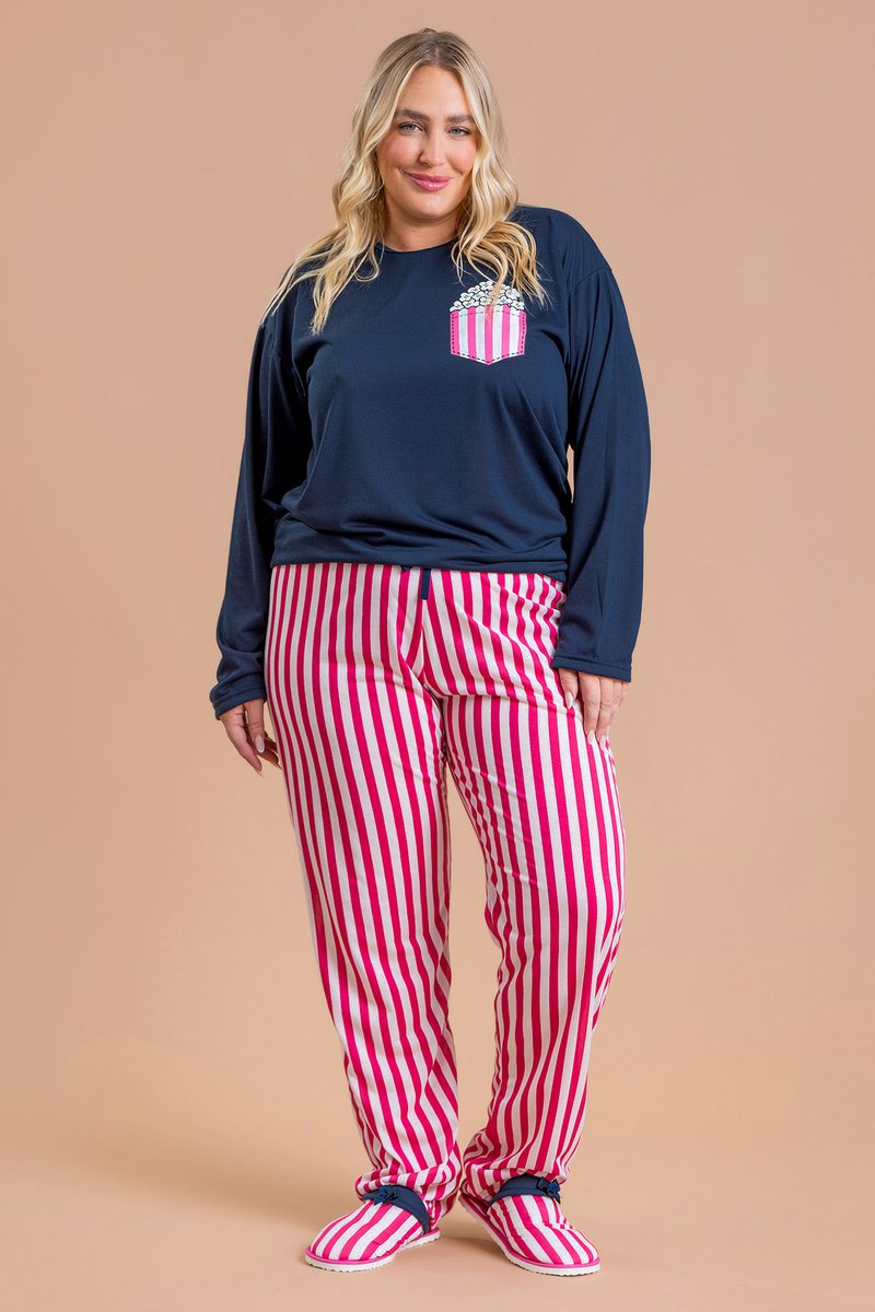 Pijama de inverno confeccionado em 100% poliéster, parte superior com estampa de bolso com pipoca e inferior com estampa rotativa em listras e com cadarço decorativo no cós.