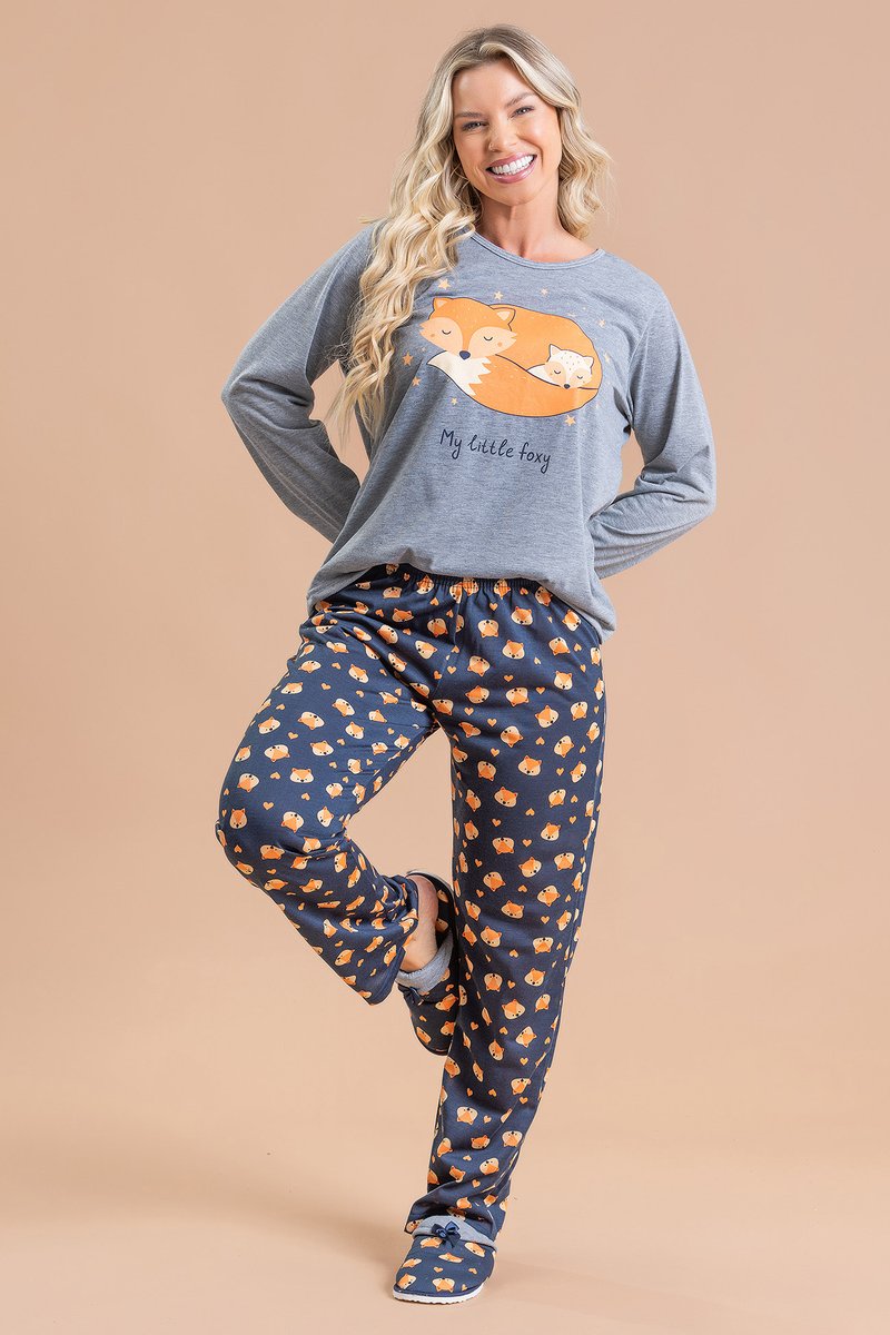 Pijama de inverno confeccionado em 100% poliéster, parte superior com estampa de raposa dormindo e frase e inferior com estampa rotativa de raposas.