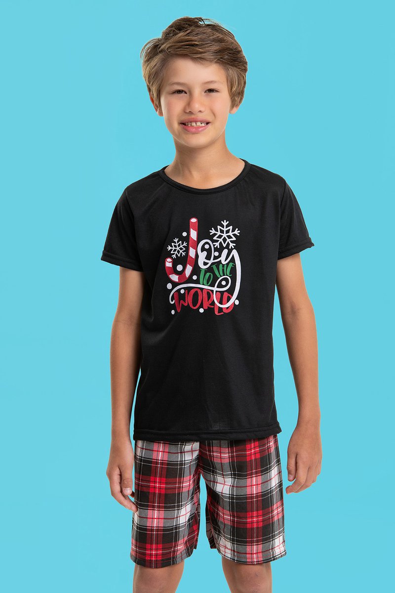 Pijama confeccionado em 100% poliéster na blusa e shorts, parte superior com estampa natalina de frase e inferior com estampa rotativa em xadrez vermelho.