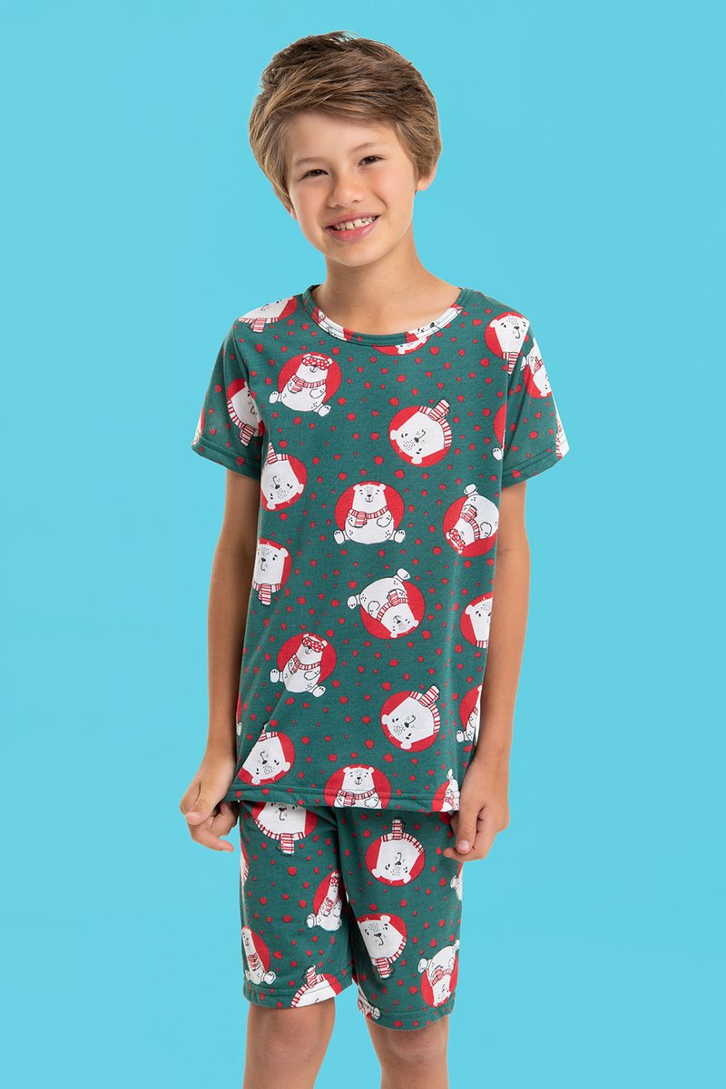 Pijama Natal confeccionado em 100% poliéster na blusa e shorts, parte superior e inferior com estampa rotativa natalina de urso polar com cachecol.